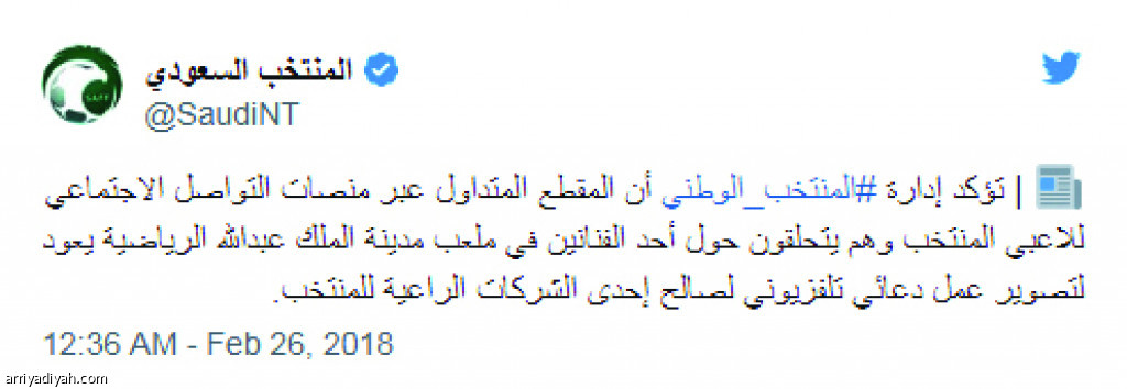 كشفت إدارة المنتخب السعودي سبب جلوس لاعبي الأخضر حول أحد الفنانين وهو يعزف على العود في المعسكر الإعدادي، وقالت في تغريدة عبر حساب اتحاد القدم على "تويتر": "تؤكد إدارة المنتخب أن المقطع المتداول عبر منصات التواصل الاجتماعي للاعبي المنتخب، وهم يطوقون أحد الفنانين في ملعب مدينة الملك عبد الله الرياضية، يعود إلى تصوير عمل دعائي تلفزيوني لصالح إحدى الشركات الراعية للمنتخب".