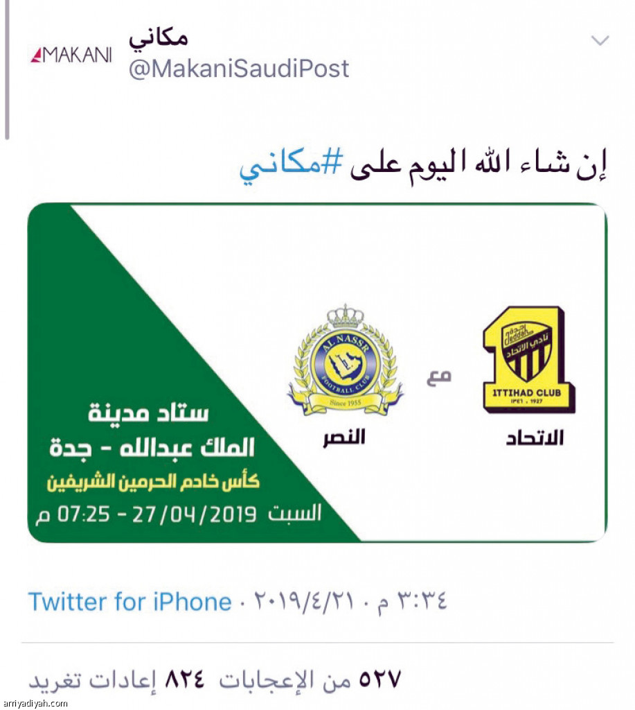 شهدت تغريدة حساب مكاني الرسمي في منصة التواصل الاجتماعي “تويتر”، التي كان محتواها “إعلان موعد طرح تذاكر النصر والاتحاد” ضمن منافسات نصف نهائي مسابقة كأس الملك، تفاعلاً كبيراً في الطائر الأزرق. وبلغ مجموع المتفاعلين أكثر من 1500 حساب مستخدم، وشهدت تداولاً واسعاً بين الحسابات النصراوية والاتحادية الإخبارية، إذ بدأ يوم أمس بيع التذاكر بتقسيم 70 في المئة من المدرجات للاتحاد، فيما النصر 30 في المئة.