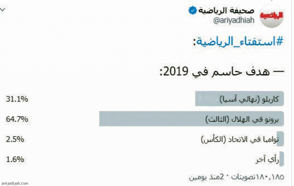 تواصل تفاعل المغردين في موقع التواصل الاجتماعي “تويتر” مع استفتاءات حساب “الرياضية” لاختيار أفضل رئيس نادٍ، وأفضل لاعب أجنبي وهدف حاسم، حيث بلغ المصوتون 996265 حتى الحادية عشرة مساء أمس.