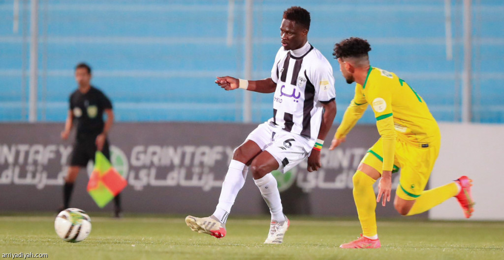 صورة التقطت أمس للسنغالي سليمان سيسيه، لاعب فريق هجر الأول لكرة القدم، لحظة تمريره الكرة خلال مواجهة العروبة وسط متابعة من عبد الرحمن العنزي لاعب العروبة (المركز الإعلامي ـ هجر)