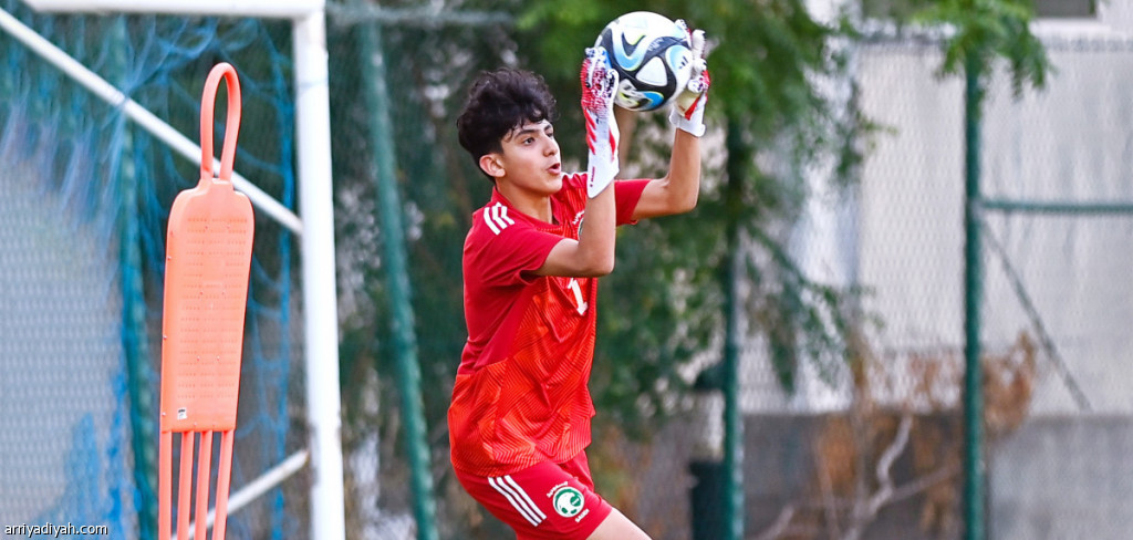 صورة التقطت أمس الأول لسيف الجرباء، حارس مرمى المنتخب السعودي تحت 15 عامًا لكرة القدم، يمسك كرةً خلال التدريبات التي جرت على ملعب أكاديمية النادي الأهلي (المركز الإعلامي ـ اتحاد القدم)