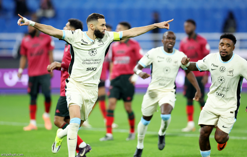 وسجّل النجم الفرنسي العالمي كريم بنزيما، قائد الاتحاد، 3 أهداف «هاتريك» في الدقائق 13 من ركلة جزاء و28 و35، لينهي الفريق الشوط الأول متقدمًا 3ـ0.